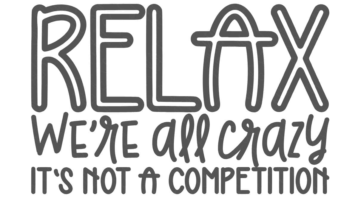 Relax, We're All Crazy, It's Not A Competition SVG Cut File is a fun design for someone with a sense of humor. This funny SVG will look great on shirts, hoodies, tumblers, mugs, hats, totes, home decor, and more!