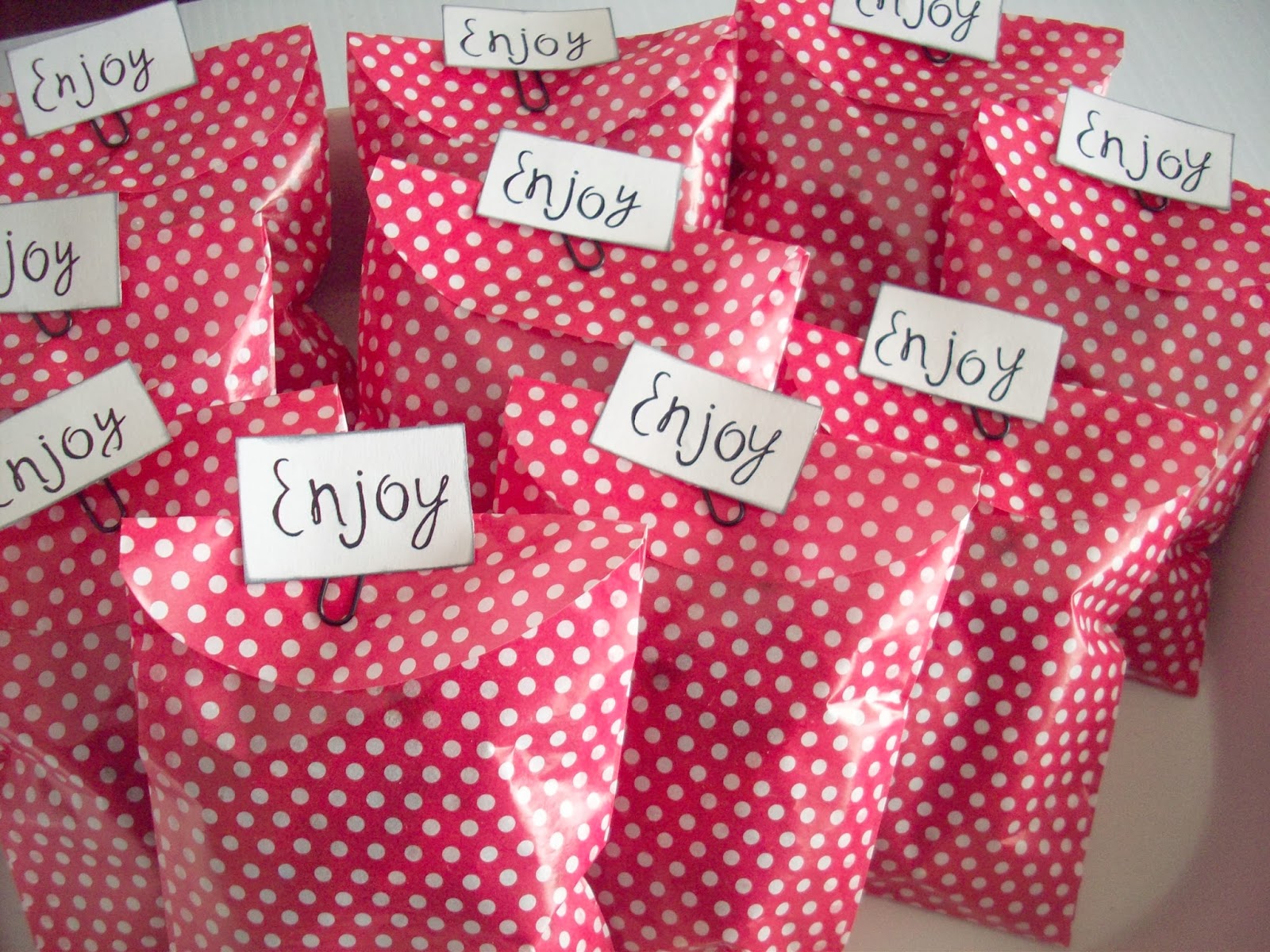 I needed some treats for a little party this weekend so I filled some cute red paper sacks with my M&M Snack mix and folded over the top. To keep closed I placed a black paperclip on each one - and to make it cute I taped on a piece of cardstock with the word "Enjoy".