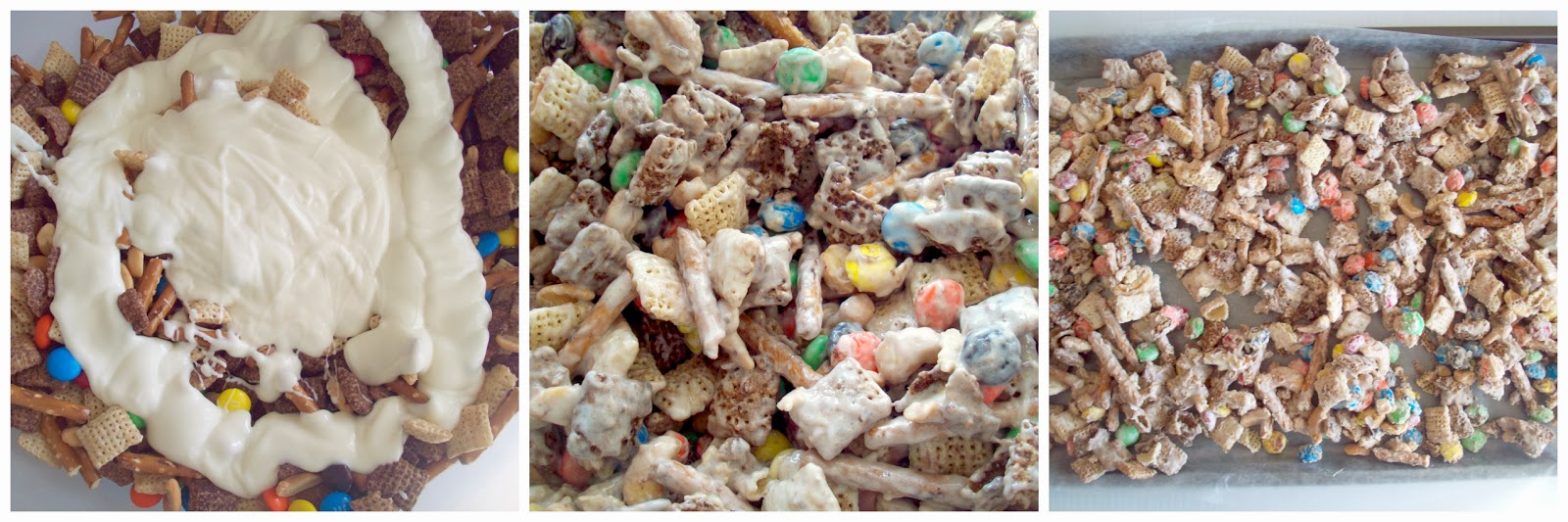 Step 3 - Pour the melted chocolate on your mix and stir together. Quickly transfer to a wax paper lined cookie sheet to dry. It was pretty cold at my house so it all dried within 5 minutes. Break into small pieces and store in an airtight container.